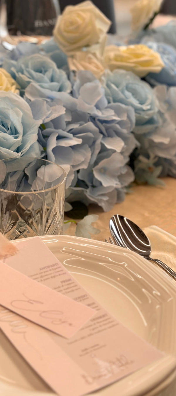 Menu' e segnaposto completano la mise en place.; li realizzo COORDINANDOLI ALLA GRAFICA DELL'EVENTO, per impreziosire la tavola e rendere l'esperienza degli ospiti ancora più curata e speciale.